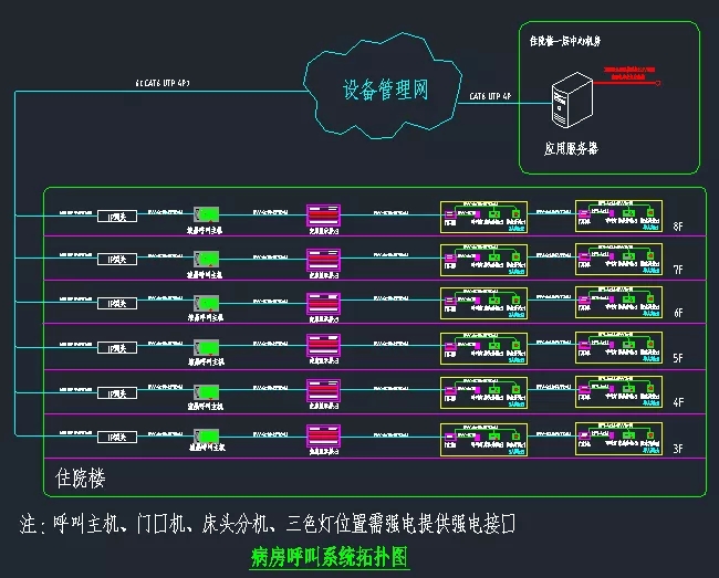 4)、中心設(shè)置:本系統(tǒng)中心設(shè)置在住院樓一層中心機(jī)房,系統(tǒng)預(yù)留與HIS共享數(shù)據(jù)的接口。