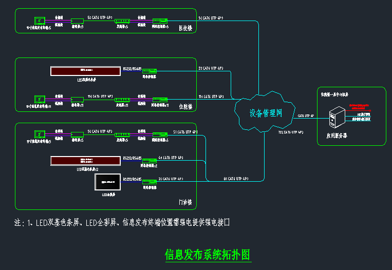 本系統(tǒng)采用先進(jìn)的流媒體轉(zhuǎn)發(fā)技術(shù),采用標(biāo)準(zhǔn)的網(wǎng)絡(luò)通訊協(xié)議實現(xiàn)信息播放的定點或者定區(qū)域;播放終端設(shè)置:在門診樓大廳設(shè)置全彩LED顯示屏屏體;門診樓收費處、掛號處設(shè)置雙基色LED屏;住院樓一層設(shè)置雙基色LED屏;所有電梯廳設(shè)置19寸LED顯示屏;